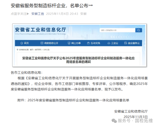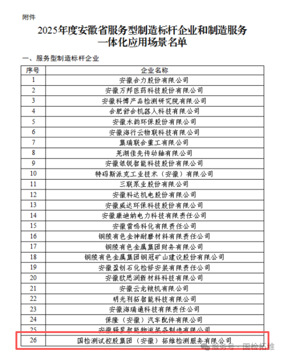 近日,安徽省工信厅公示2025年度服务型制造标杆企业和制造服务一体化应用场景名单,国检拓维凭借“制造+服务”深度融合的创新实践成功获评“服务型制造标杆企业”。